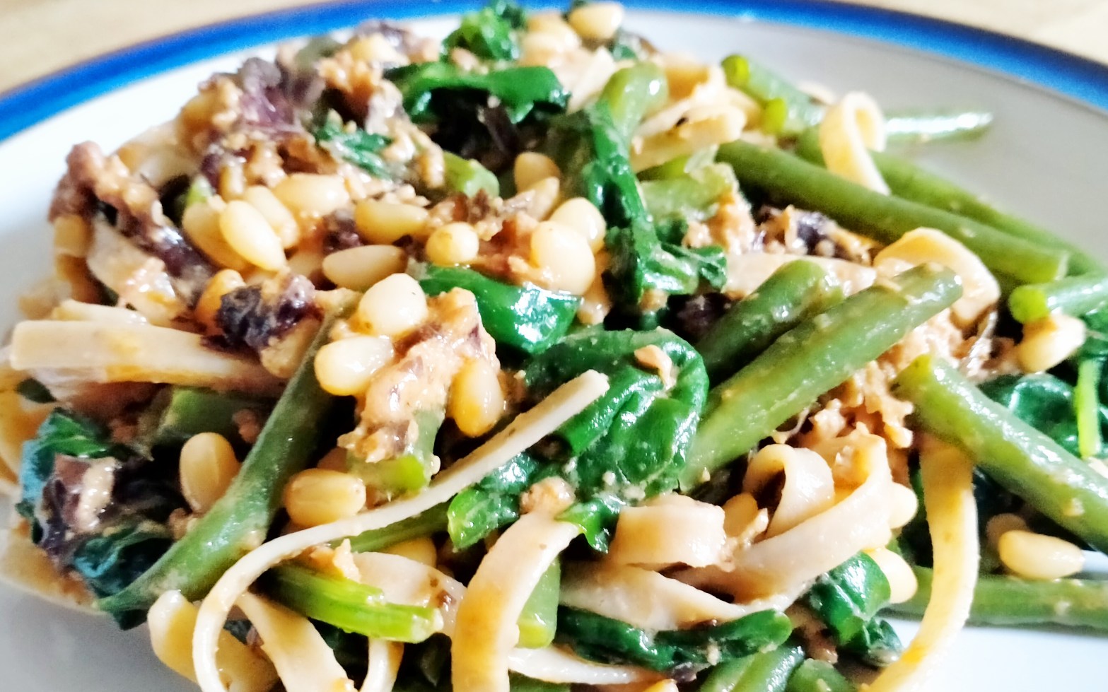 Fry the garlic, onion, Tofuna, pine nuts, seaweed, tarragon and spinach in some oil in a frying pan. At the same time put the pasta and green beans on to boil. When the pasta is nearly ready add the creme fraiche to the frying pan to make a sauce and heat through. Drain the beans and pasta and when the sauce is ready stir together over a medium heat. Serve and drizzle with oil to finish