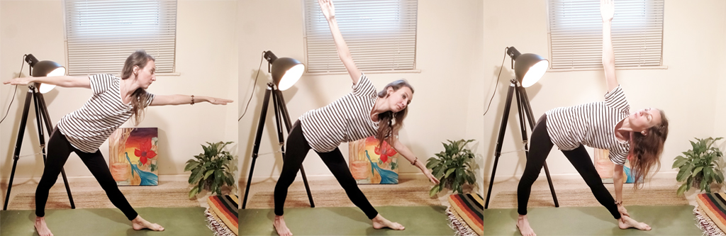 The transition into trikonasana feels much like dancing, and I think it is because of the tensegrity inherent in it. The legs are rooted into the ground, the front arm extends forward parallel to the floor, and the head follows. This is a perfect example of tensegrity at work. All the parts of the body follow the same narrow line, not wider than your foot width apart. Legs are active, which draws the abdomen in. The arms are active opening the chest. To finish it off the head turns to face upwards, and the gaze leads, drawing the head with it. Holding the pose, torso suspended in air, relies on half the muscles being isometrically contracted, and that is whre you can appreciate the tensegrity. The body is active, yet unmoving, working yet poised.