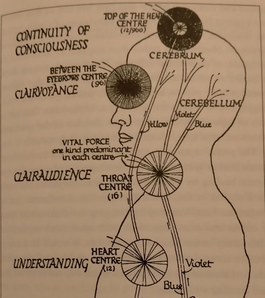 In drafting this post I have come across a diagram from 1925 that suggests there is indeed a direct link between the heart and the top of the head chakras. I must also mention that the connection was cemented by a simple visualisation that was taught to me just last week (serendipitously) by Tarik Dervish. ‘Imagine a silver thread connecting the heart to the head’, he said.