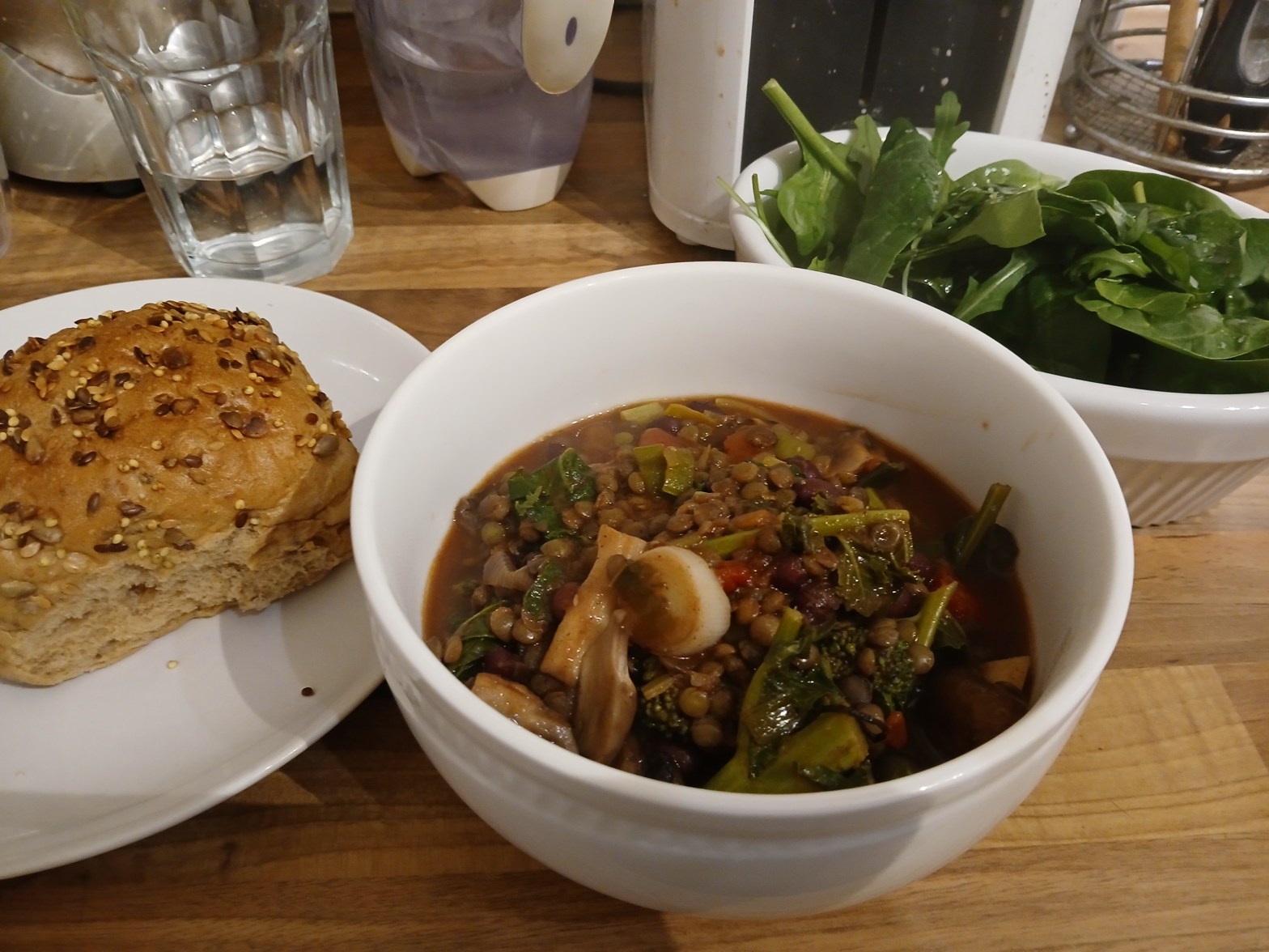 Put lentils on to boil in some water and stock. Chop leeks and fry in a little oil in a large frying pan. Add spices, curry leaves etc to frying pan. Chop broccoli and add to frying pan. Chop mushrooms and add to frying pan. Once veg have been coated in oil and spice, add stock water, tomatoes and purees to frying pan. Add black beans. Bring to boil and simmer. As soon as lentils are cooked – roughly 25 minutes – add to pan and simmer for a further 20minutes. Serve with bread and a generous dollop of tahini.