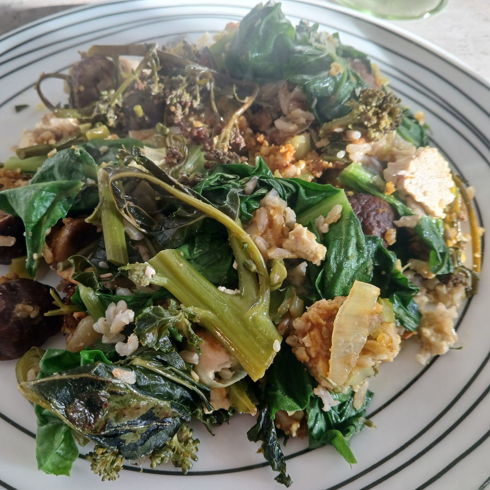 Put the rice on to boil, optionally add some stock to the water. Chop leeks, garlic, parsley and chestnuts. Boil broccoli for 10-15 minutes, drain when cooked. Mix up the “yolk” into a smooth paste. Once the rice is cooked, put some oil into a large frying pan. Fry the leeks, garlic, parsley, chestnuts, sesame seeds and rice. Add the yolk. Crumble the tofu onto the mix. Add the broccoli. Add spinach. Stir fry for 10 minutes, or until heated through. Serve with hoisin sauce.